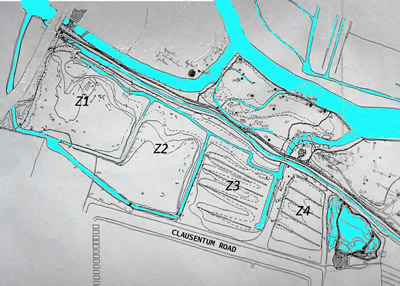 Diverse water life also requires a balance of good light for basic vegetation and protective cover for the vulnerable predated species. Our plan addresses the management of reliable water flows, sunlight and protective cover. The site can be usefully described in four roughly equal zones: