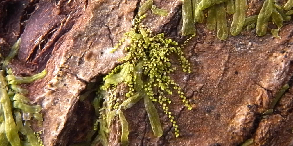 Cololejuenea minutissima, perhaps the smallest liverwort on the Fen, with the flat branches of Metzgeria furcata (a thallose liverwort).