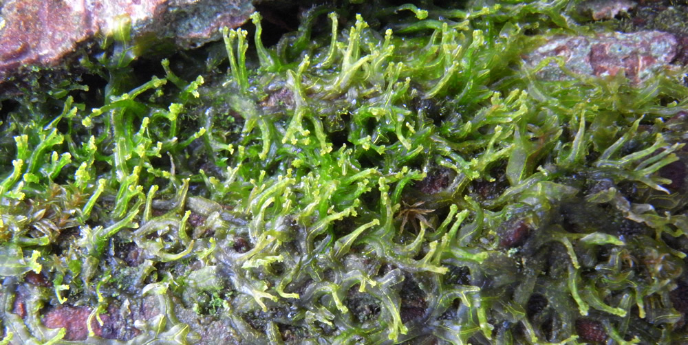 Metzgeria violacea, an intricate thallose liverwort with clusters of green gemmae at the tips of the branches.