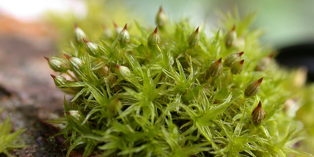 Ulota phyllantha, a cushion-forming moss with clusters of brownish gemmae at the tips of the leaves.